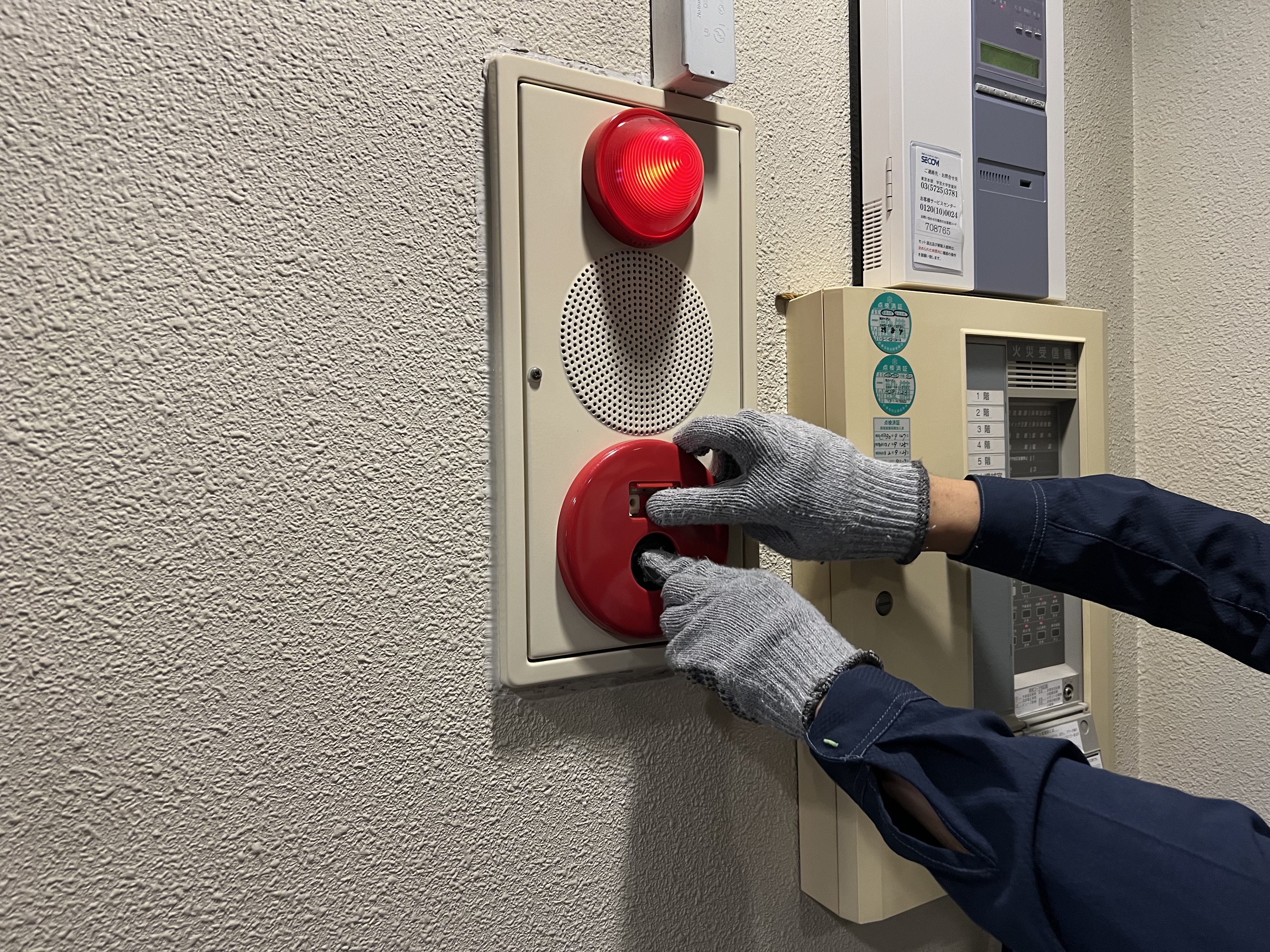 写真は、発信機の動作確認、避難器具の点検時の光景です。